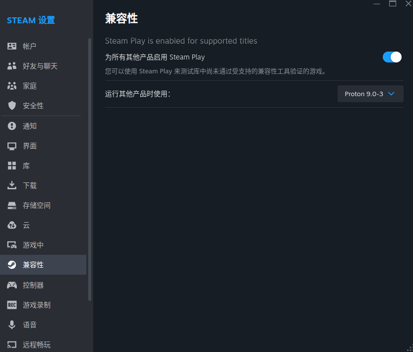 兼容性->为其他产品启用steam Play,运行其他产品时使用选个最高级的Ok