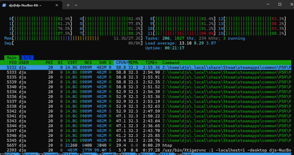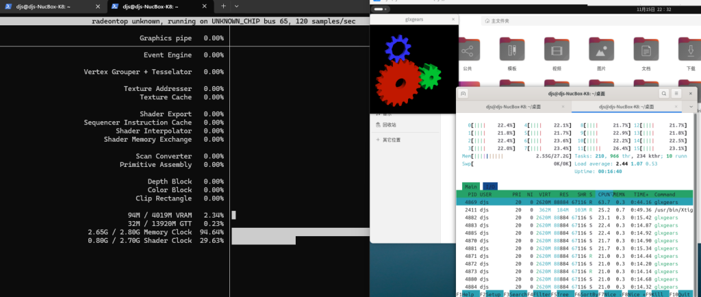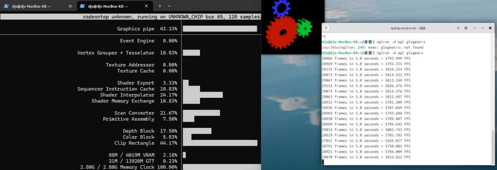P5R这种低负载游戏,2K75Fps就是应该完全没有问题的,第一次这么直观看到有没有GPU的差距,所以我需要咋么办呢,我这里怀疑可能Steam无法在VNC调用GPU,然后用了一个glxgears,图形化测试GPU工具,好家伙果不其然。。。