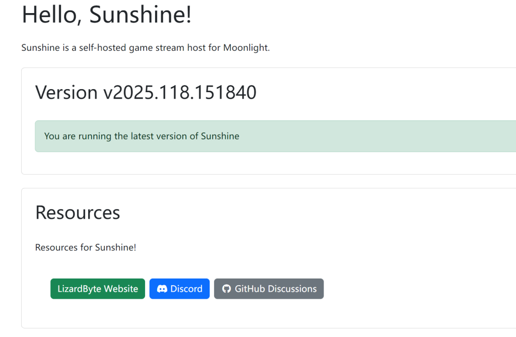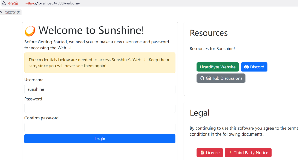完事后应用列表里搜索下sunshine,会弹开网页。会显示不安全,但是点击高级->接受风险即可。