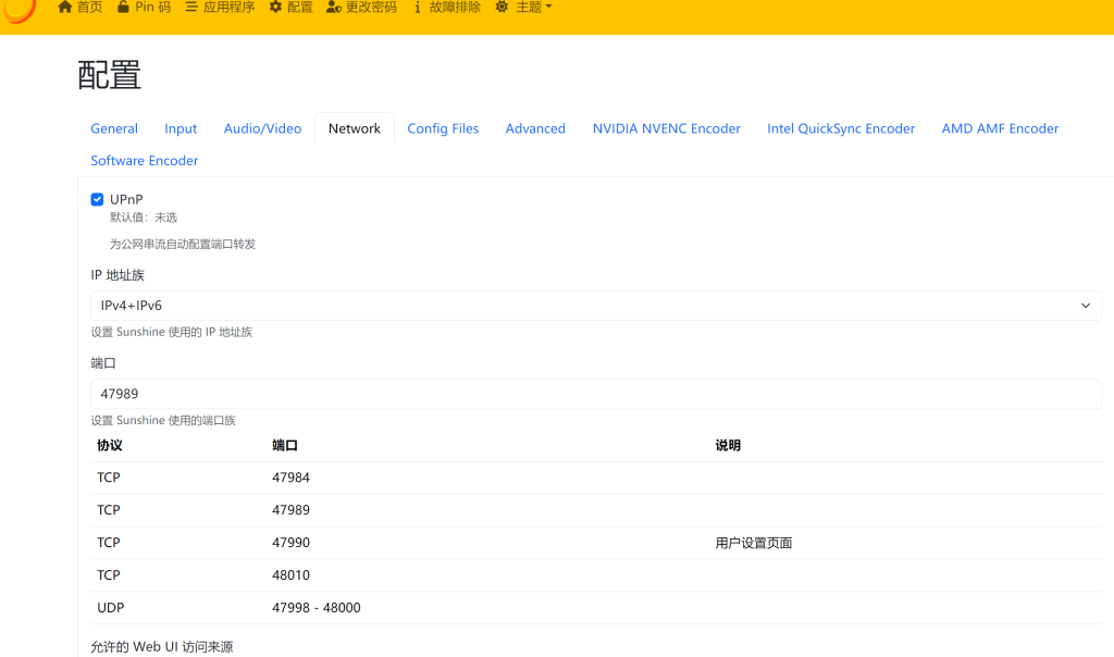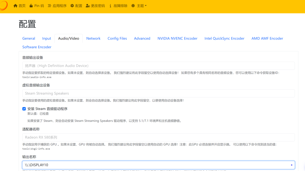 回到我们之前的配置,sunshine,点击配置,Audio/Video,找到输出设备,修改为刚才记录下来的编号。