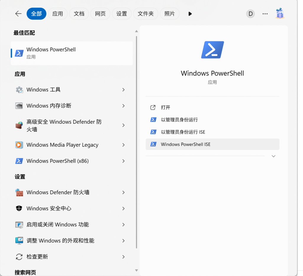 - 右键点击 Windows 开始菜单,以管理员身份运行 Windows PowerShell(注意不是 CMD)。