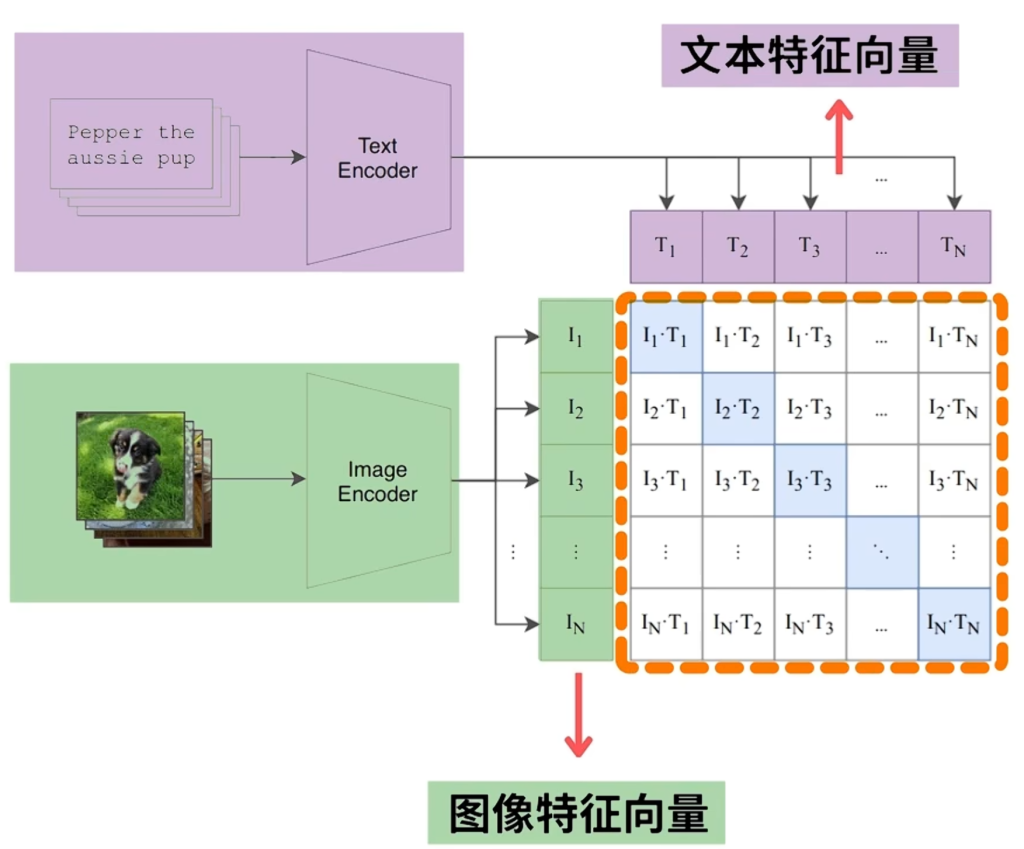 - 原理:可以把文本的向量特征和图像的向量特征都放在同一个特征空间中,这样我们就可以判断图片和文本的相似程度(点积),从而做到图生文or文生图这样基本的模态转化。