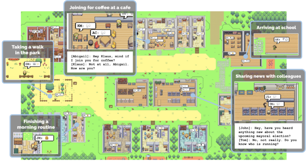作者为此做了一个Smallville,在这个沙盒里面,放置25个智能体。模拟他们类似的真人生活,他们拥有自己的身份人物关系之类的。