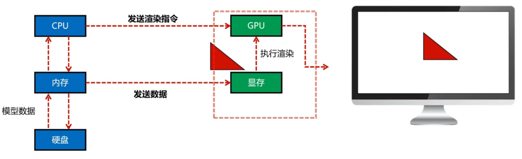 立即渲染模式(Immediate mode,也就是固定渲染管线):绘图方便,容易理解,但是效率太低。已废止