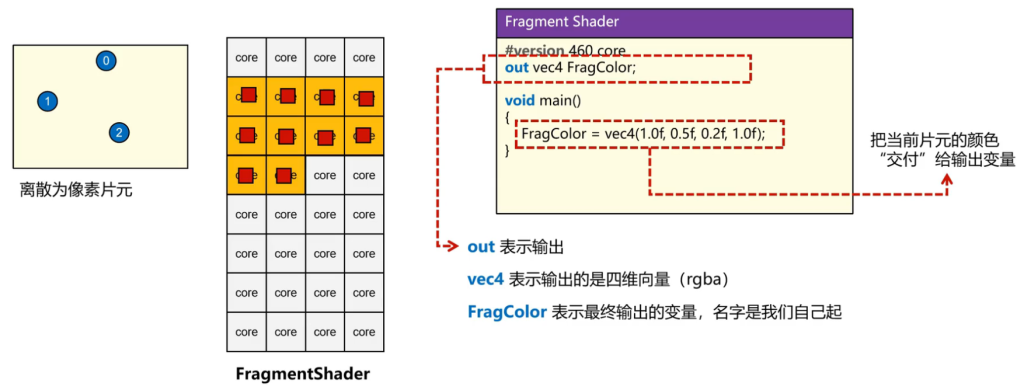 - 装配好后就会传入光栅化阶段,进行光栅化。这里它会把图元映射为最终屏幕上相应的像素,生成供片段着色器(Fragment Shader)使用的片段(Fragment)。