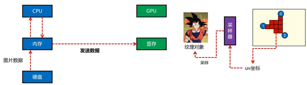 对于硬盘中的数据,CPU发送指令读取,读取后读到内存中,接着发送到显存中。根据最终绘制图案光栅化的结果,对于中间每一个点都有uv坐标的插值,把这个交给采样器,从纹理对象中获得最终的采样。
