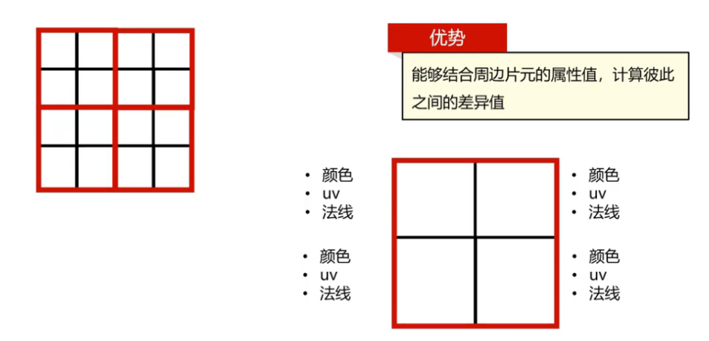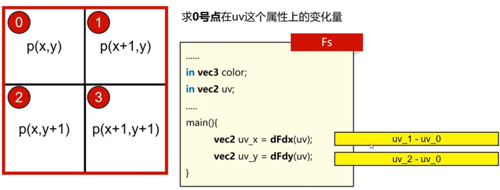 对于GPU处理FragmentShader时候,不会每一个片元单独处理,而是编程一个2*2的区域进行处理。借助这个,我们可以计算出相邻像素在某些属性上的变化量。