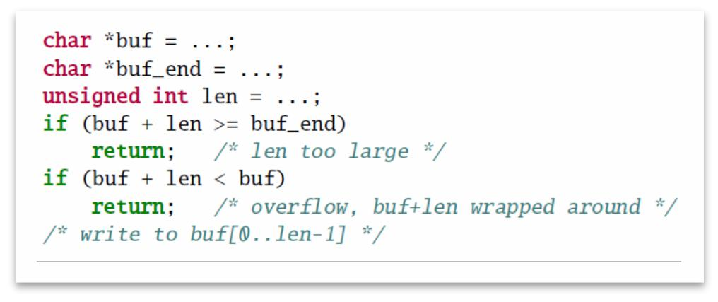 在 C 的规范中,指针的溢出是 undefined behavior,编译器会认为这不会发生这种情况,因此把这段代码删除掉了。