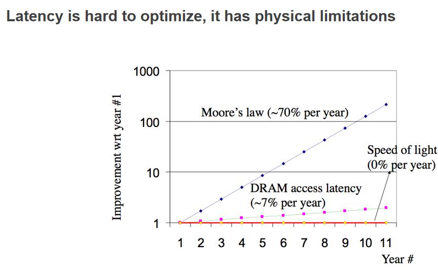 系统的时延是很麻烦的事情,因为吞吐量可以通过花钱添加服务器来增加。 但是要缩短每个人访问的时延是很难的,它受限于物理物理原因,哪怕是光速时间延迟也会很大。