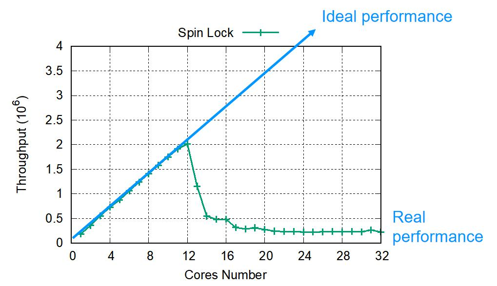 32 个核的时候和 1 个核的时候差不多,这是因为大家都在抢 spin lock。Spin lock 是内存中的一个 bit。随着 cpu 越多,争抢锁的消耗越大。