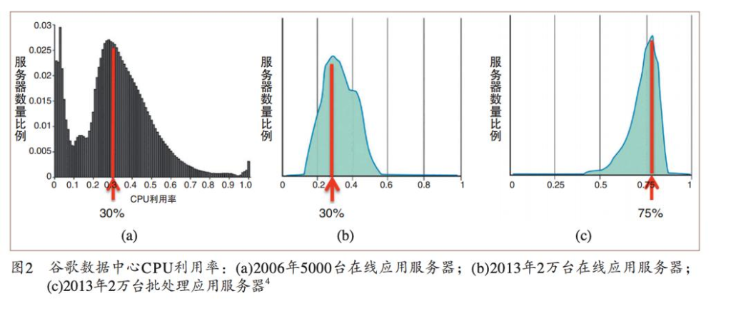 对于云来说,Google 数据中心的 CPU 利用率是 30%。对于要求快速响应的服务器,需 要预留很多资源,所以云端的服务器都开着虽然耗着电,但是利用率并没有拉满。