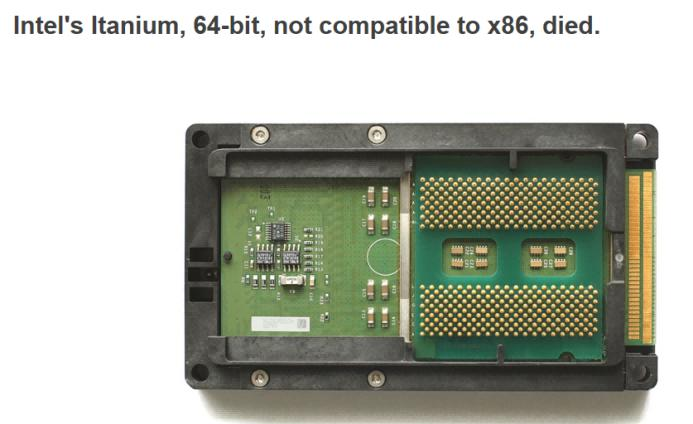 安腾处理器是 inter 从 32 转 64 的重大选择。导致之前所有的 x86 代码都需要重新编译 才能跑