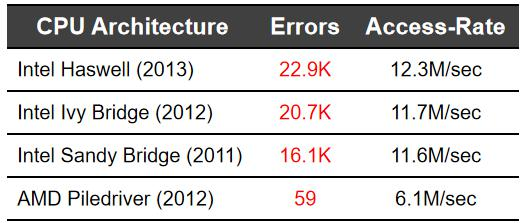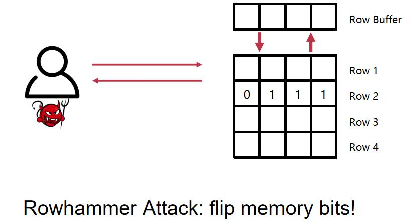 在我们的内存中,存储模式是先定位行再定位列,内存需要为这一行进行充电操作,在 充电的时候,临近两行的电就会弱一点点。如果我们频繁地读 row1 和 row3 会导致 row2 的 电量下降,下降到一定程度的时候,row2 的 1 就会变成 0