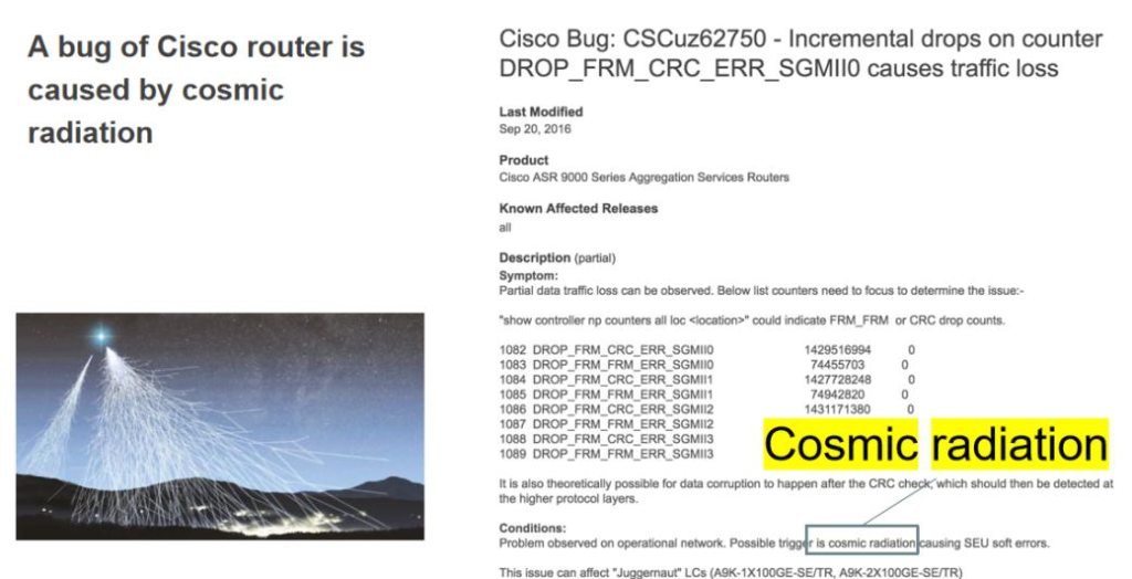 Cisco 路由器厂商的 bug report,由于宇宙辐射造成的 bug。