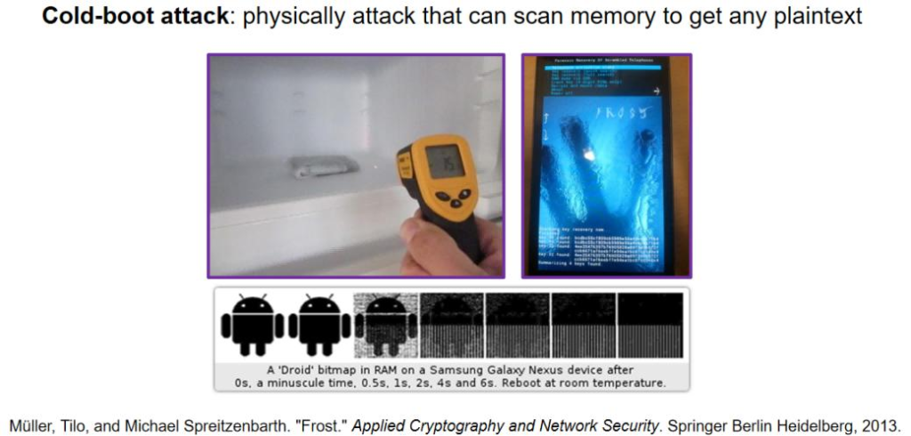 以手机为例,里面有一堆关键的数据和账号。内存在掉电之后,数据不会马上丢失。放在非常冷的环境下,可以延缓这个过程。手机内存芯片其实就是一个 SSD,可以直接读只是数据加密了。数据加密的密钥放在 DDM。内存里是明文,加密到硬盘里是密文。现在保护数据基本上是保护硬盘上的数据,而不保护内存上的数据。
