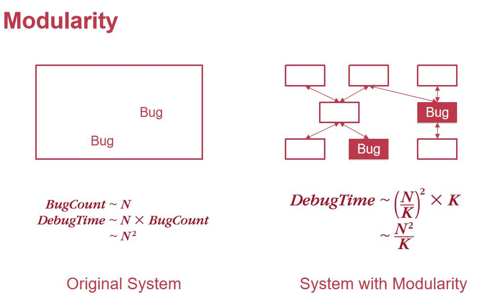 在 linux 内核中,通过估算大约每一千行有一个 bug。对于我们自己的代码,预估的是一 个没有发现的东西,比较难以估算。 Debug 的时间等于代码的行数*bug 数量,所以就是 O(代码行数) ,拆分成 K 个小模块之后,总的时间复杂度就可以除以 K。
