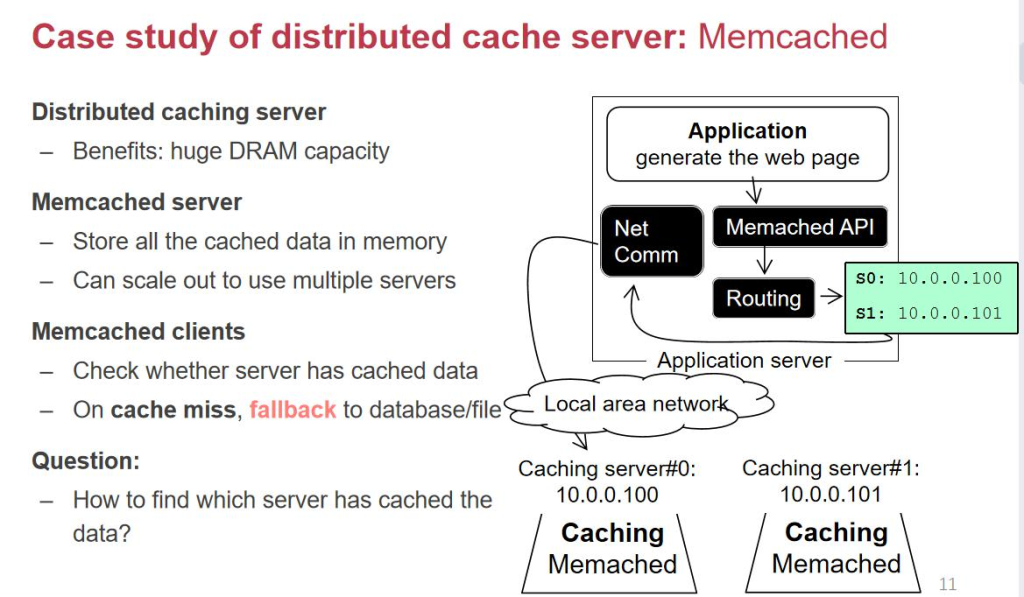 - 把数据分布在多个缓存服务器上,用哈希算法定位数据存储的位置。